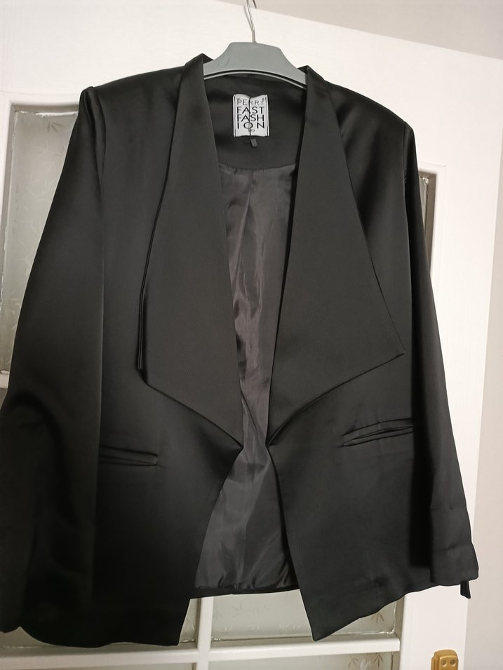 Siyah, ipek gibi dokulu, normal uzunlukta midi blazer. Notlu yakalı, uzun kollu ve desen içermeyen, rahat kesimli şık bir ceket.