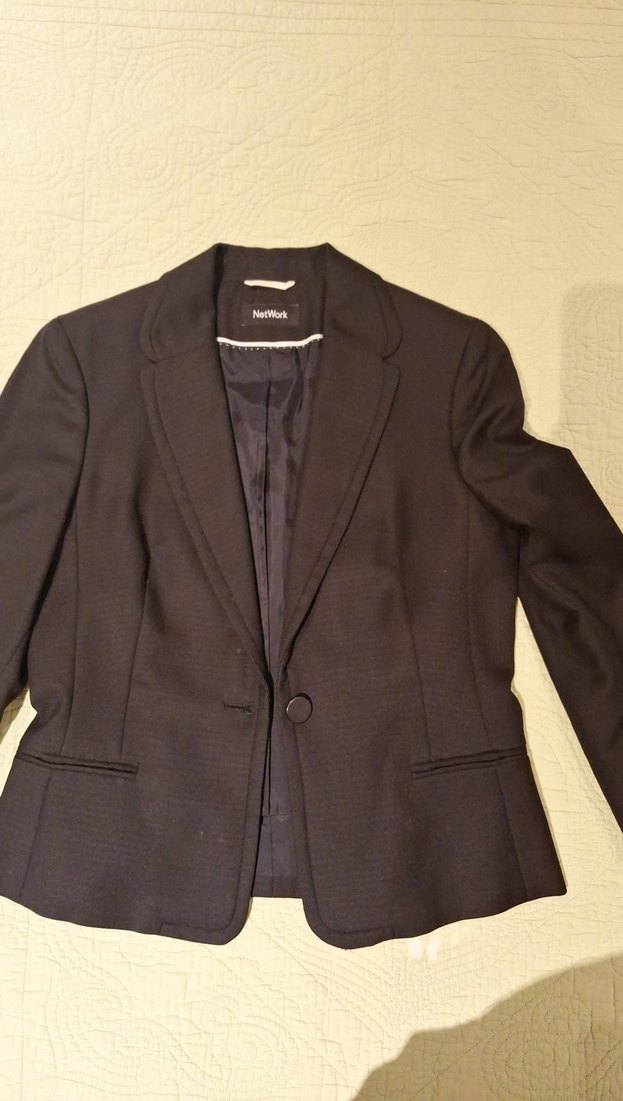 Siyah renkli, düğmeli, normal boy midi blazer ceket. Notch yaka ve uzun kollu, klasik ofis şıklığı için ipeksi dokuda.