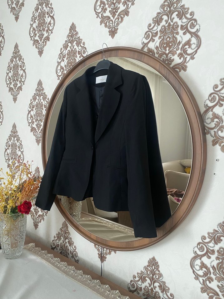 Siyah renkte, ipeksi kumaştan yapılmış, uzun kollu ve düğmeli kadın blazer ceket. Normal kesim ve midi boyda, ofis için uygundur.