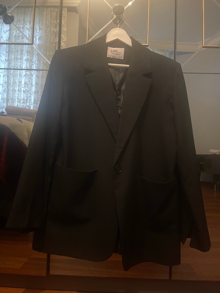 Siyah, yakalı ve düğmeli kadın blazer ceket. Uzun kollu, normal kesim ve midi boyda, yumuşak ve sıcak kumaştan üretilmiştir.