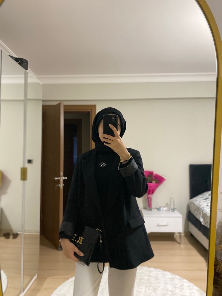 Siyah kadın blazer, notched lapel yaka ve uzun kollu, düz dokulu sentetik kumaştan. Günlük kullanıma uygun, rahat kesimli ve minimalist tarzda midi boy.markası belirsz