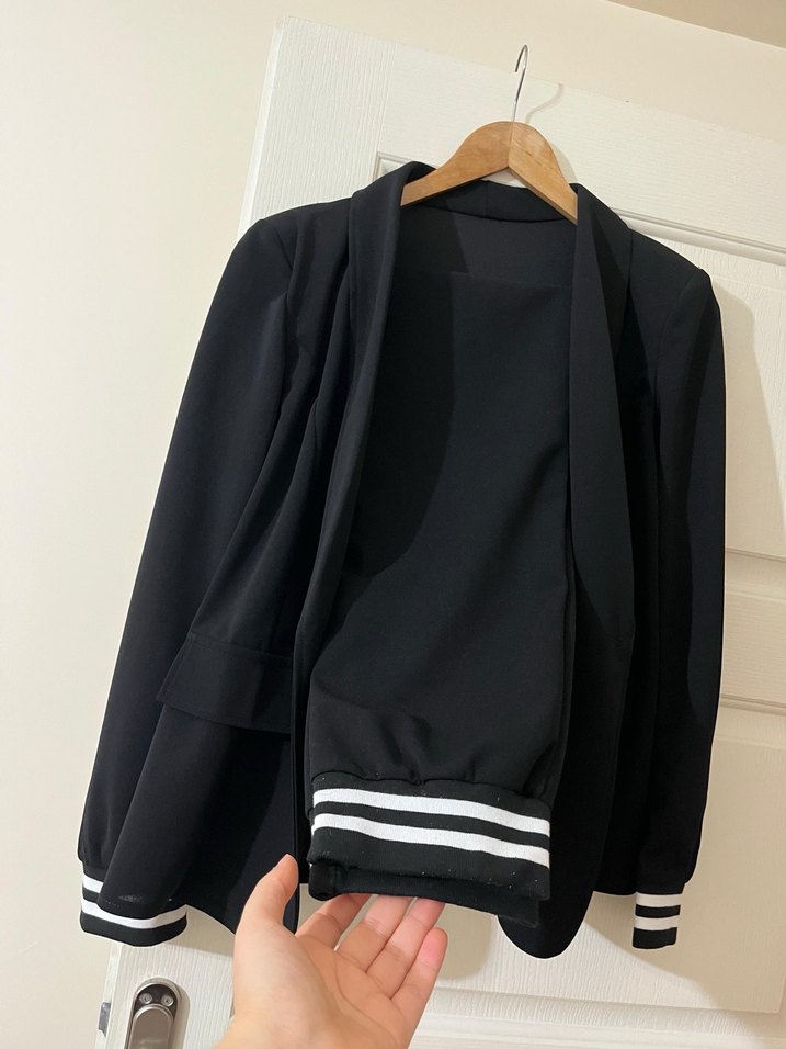 Siyah renkte, normal boyda kadın blazer. Notch yaka ve uzun kollu, pile detaylı ve çizgili manşetlere sahip, sentetik kumaştan üretilmiştir.