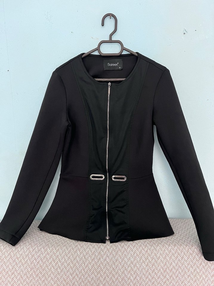 Uzun kollu, regular fit siyah kadın ceket. Fermuarlı ve kemer detaylı, modern tasarımıyla ofis kullanımı için uygun. Belden Oturtturmalı En 34 Boy 60