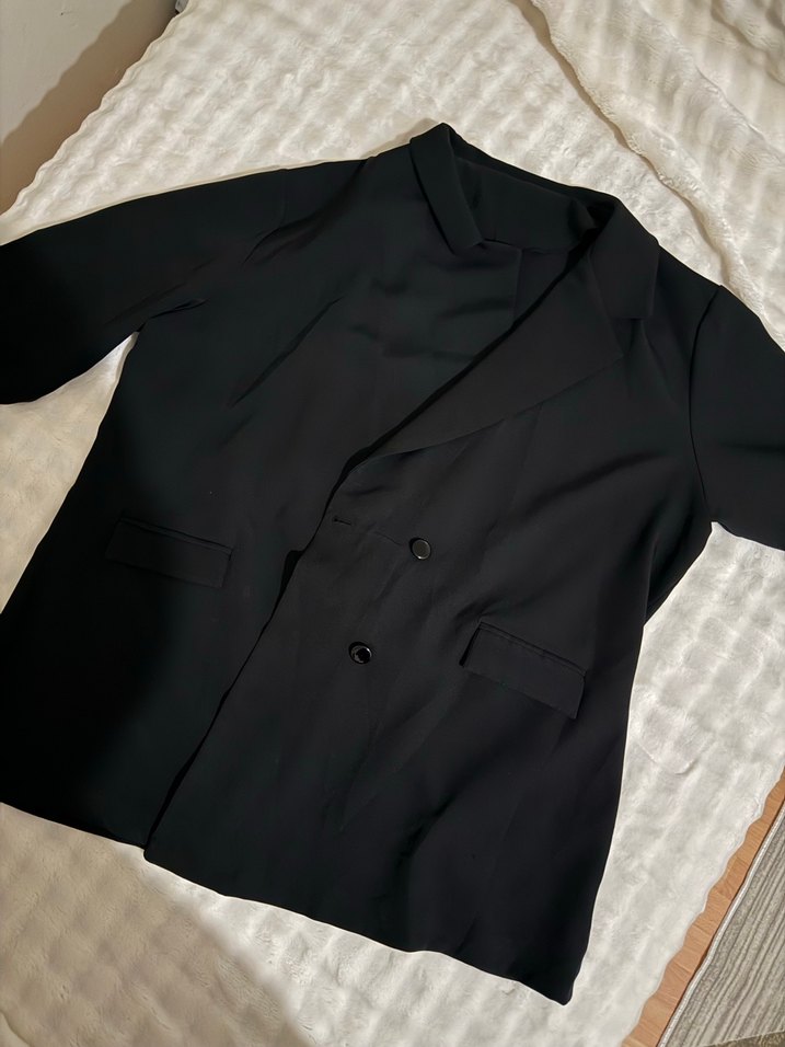 Siyah renkli, düğmeli, normal kesim ve midi boy kadın blazer ceket. Uzun kollu ve yakası kesimli, ofis için uygundur.