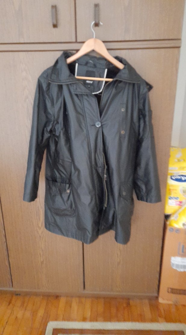 Siyah renkli, düğmeli, normal uzunlukta midi boy kadın yağmurluğu. Notched lapel yakalı, uzun kollu ve bol kesimdir. Günlük kullanıma uygundur. ️