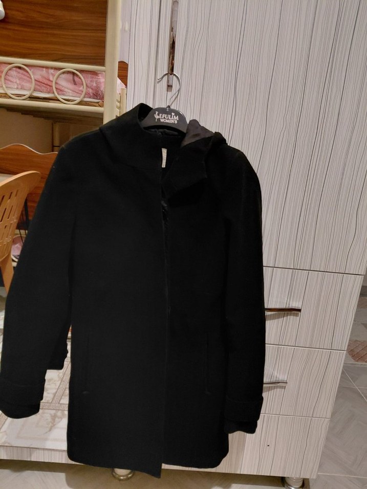 Siyah renk, normal uzunlukta kadın kaşe kaban. detayları ve kesik yaka tasarımı ile rahat bir kullanım sunar. Uzun kolludur ve sokak stiline uygundur. az kullanılmış.