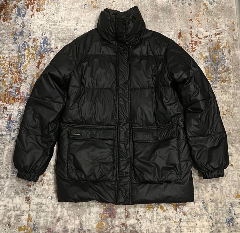 Siyah renkli, yüksek yakalı ve uzun kollu mont . Sentetik kumaştan üretilmiş, bol kesimi sokak modasına uygun ve rahat bir tasarım. En 55 boy 76