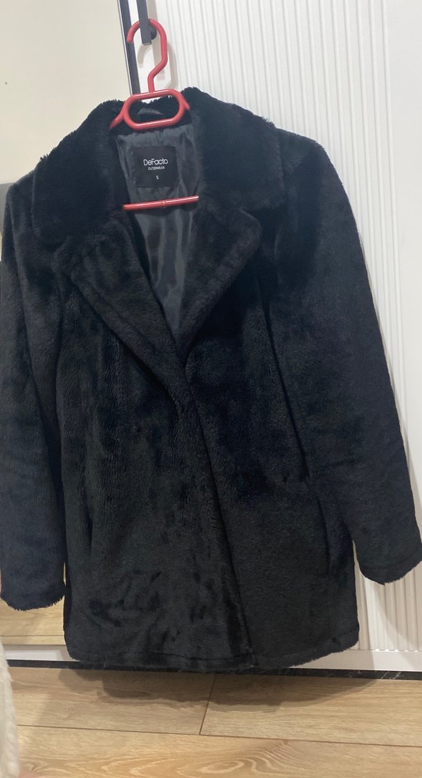 Siyah midi boy, kürk detaylı, yumuşak dokulu cekettir. Normal kesim, uzun kollu ve yakalıdır; sokak stili ve ofis için uygundur.
