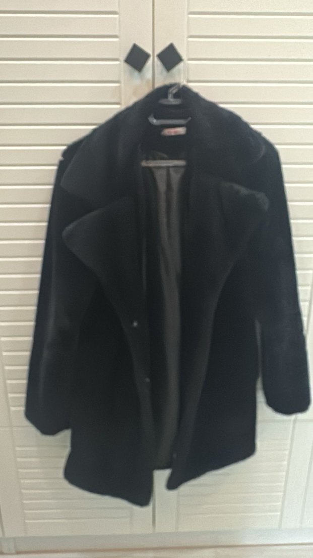 Siyah midi boy, uzun kollu, kürk detaylı ve çıtçıtlı yakaya sahip kadın kabanı. Rahat kesimi ve sıcak dokusuyla ofis kullanımı için uygundur.
