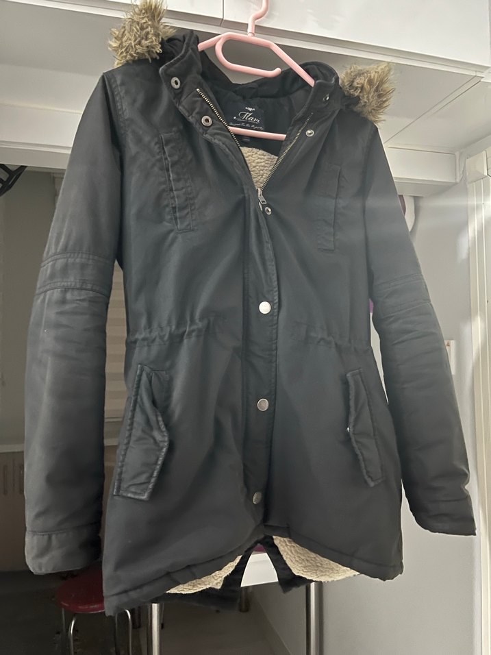 Siyah, midi boy, kürklü detaylı kapüşonlu, uzun kollu, sıcak tutan yumuşak kumaşlı, fitted kesim kadın mont.