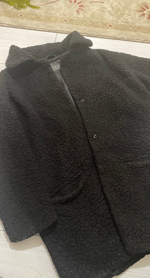 Siyah midi boy kadın kaban, peluş kumaş ve kürk detaylı kesik yaka ile tasarlanmıştır. Uzun kollu, bol kesim rahat ve sade bir görünüme sahiptir.