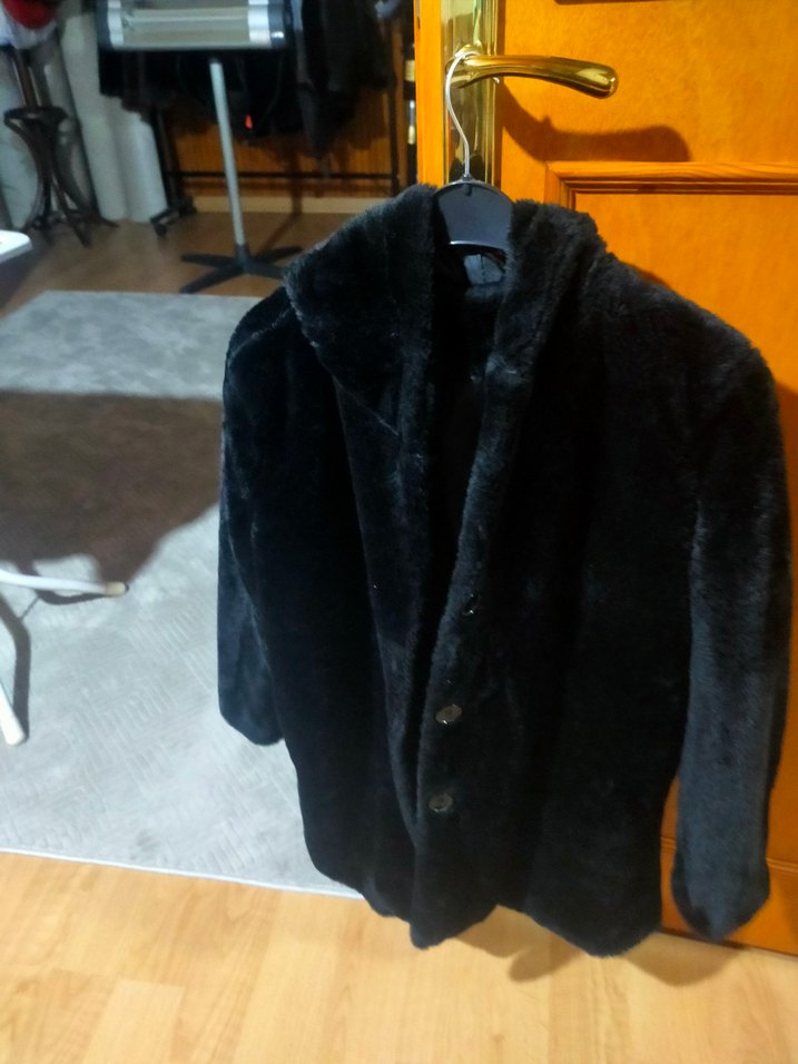 Siyah midi boy kadın kaban, yumuşak ve sıcak peluş kumaştan, kürk detaylıdır. Notlu yaka ve uzun kolludur, bol kesimdir. 38ve 40 olur