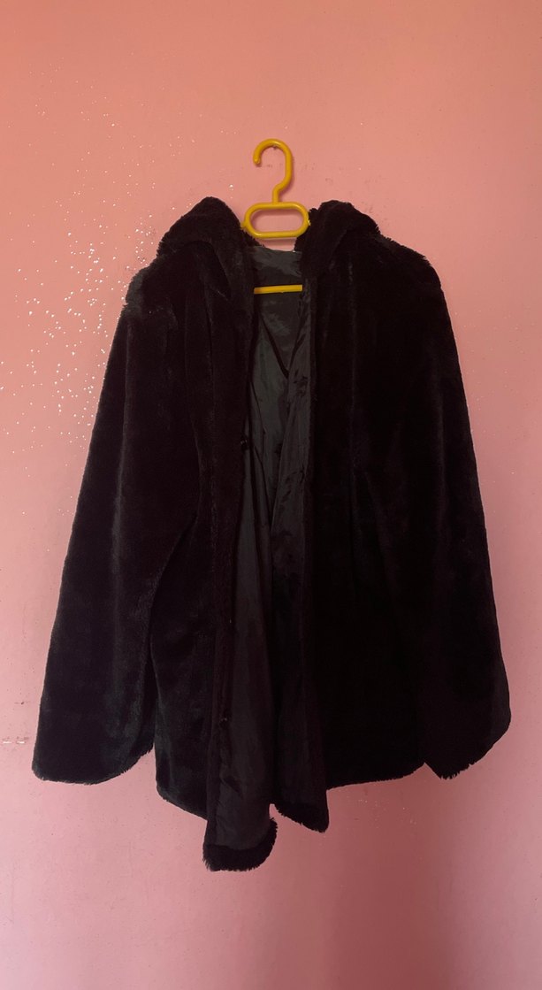 Notlu yakalı, uzun kollu siyah midi boy peluş kürk ceket. Rahat kesimi ve sıcak dokusuyla günlük kullanım için uygundur. Kapşonlu