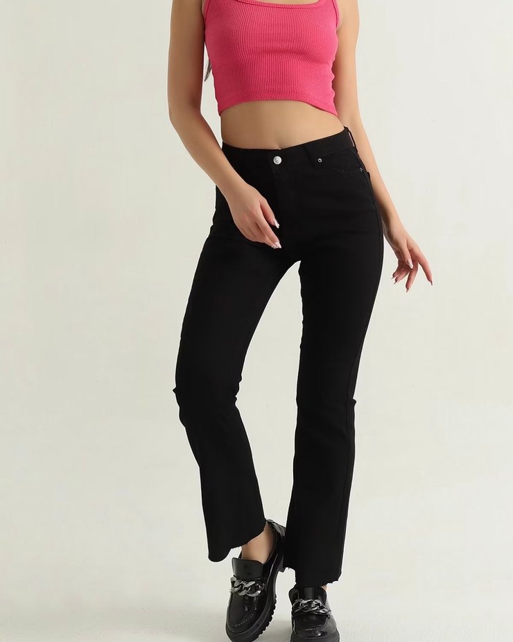 Siyah renk, midi boy ve regular fit kesime sahip kadın jean pantolon. Düz desensiz, rahat ve şık, günlük kullanım için uygun.