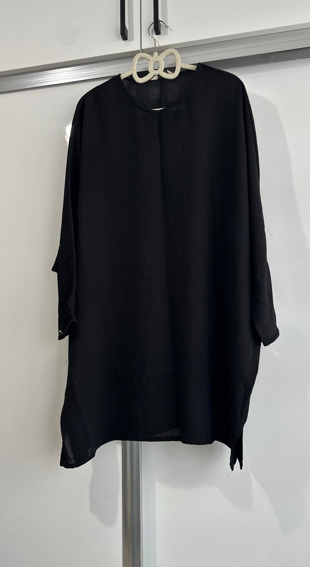 84 cm Siyah renkte, salaş kesim, uzun kollu, midi boy ve yuvarlak yakalı kadın tunik. İnce ve parlak dokulu kumaştan yapılmıştır. Minimalist gotik tarzda günlük kullanıma uygundur.