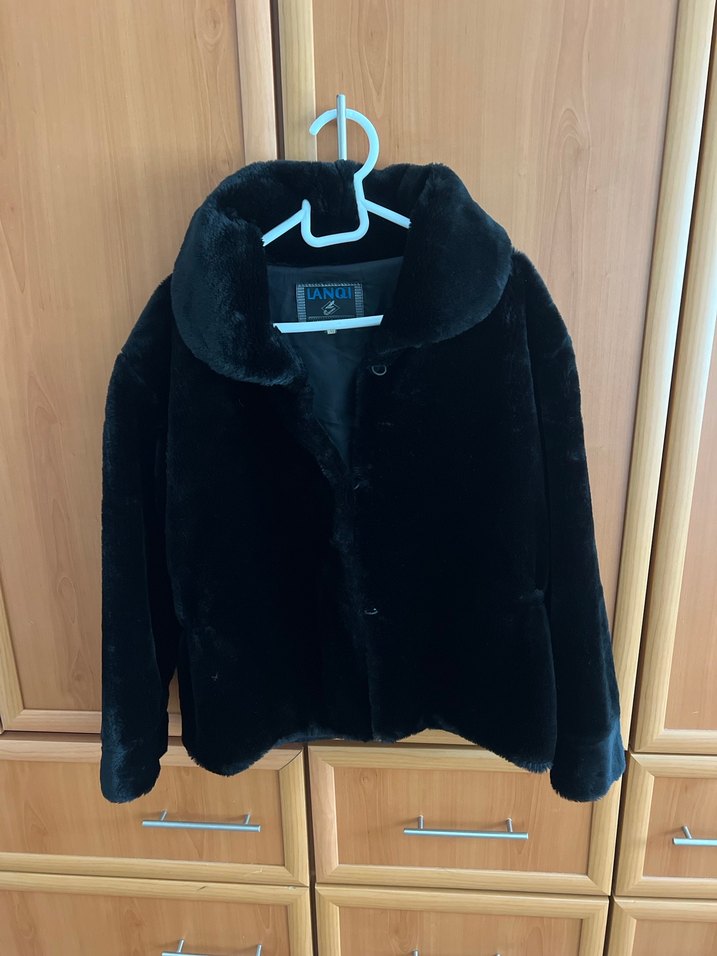 Siyah midi boy, uzun kollu, suni kürk detaylı kadın ceket. Yumuşak fleece kumaştan, rahat ve günlük kullanıma uygun. Yepyeni. Sadece bir iki kez kullanıldı. Yurtdışından aldım. Kalıbı geniş değil