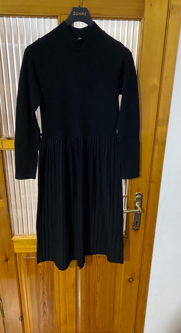 Siyah Misi Boy elbise, yüksek yakalı ve uzun kolludur. Yumuşak yün kumaştan yapılmış, pileli etek ve normal kesime sahiptir. Ofis kullanımı için uygundur.