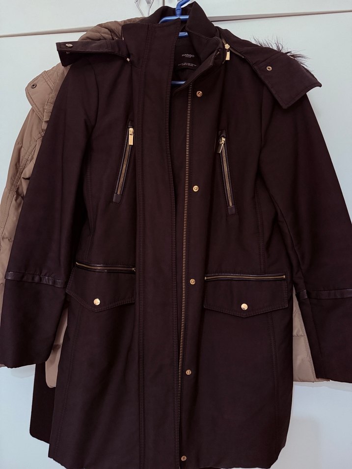 Siyah midi ceket, kesik yaka ve kürk detaylarına sahip, uzun kollu ve regular fit ile günlük kullanıma uygun.