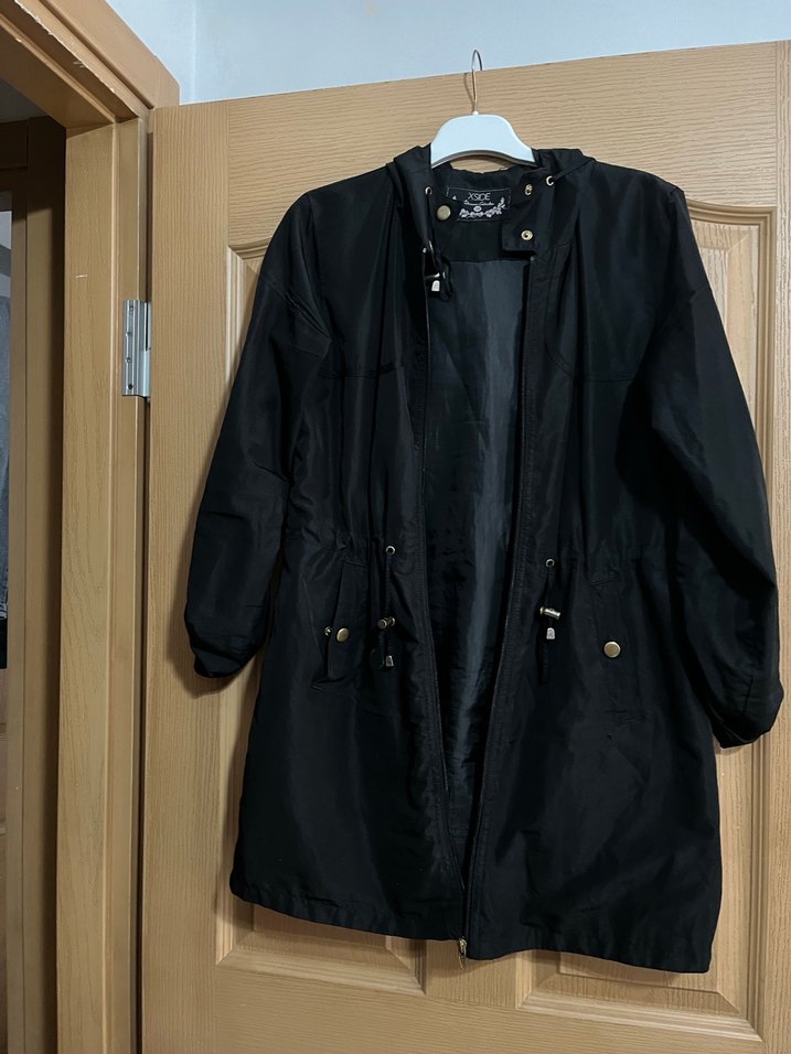 Siyah midi ceket, notalı yaka ve uzun kollu, gevşek kesim ve tokalı detaylara sahip. Sentetik kumaştan yapılmıştır, günlük kullanıma uygundur.