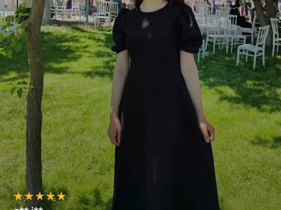 Düz siyah, kabarık kollu ve yuvarlak yaka, sentetik kumaştan yapılmış oturan kesim midi elbise, klasik gotik tarz için uygundur. xl beden ama L beden gibi