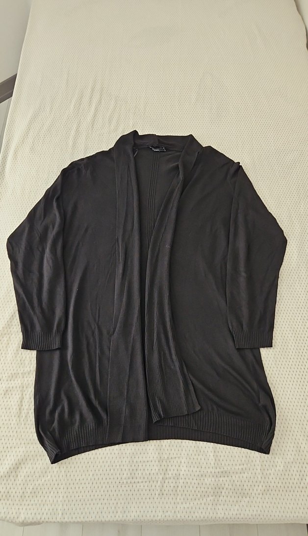 Siyah renkte, rahat kesim midi uzun kollu kadın hırka. yakası kesikli ve minimalist normcore tarzda, günlük kullanıma uygun. 3XL