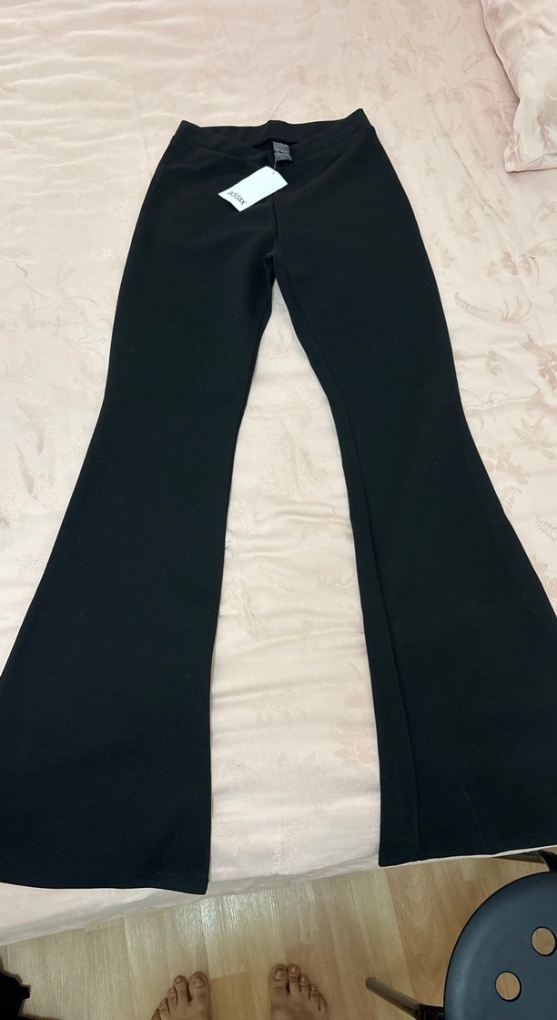 Siyah, dar kesim midi ispanyol paça pantolon. Pürüzsüz sentetik kumaştan, ofis ve günlük kullanıma uygun.