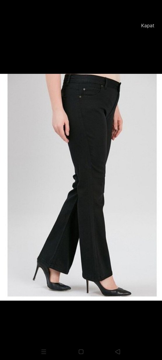 Siyah, midi boy, ispanyol paça kadın pantolon, düz kesim ve sentetik kumaştan. Minimalist normcore tarzıyla ofis için şık ve rahat bir seçenek.