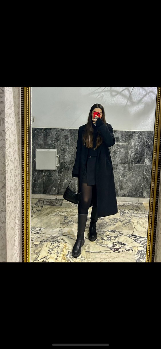 Siyah uzun kollu ve kesimli midi kaban. Notlu yakasıyla günlük kullanıma uygun, gotik ve sokak stilini yansıtan şık bir parça.