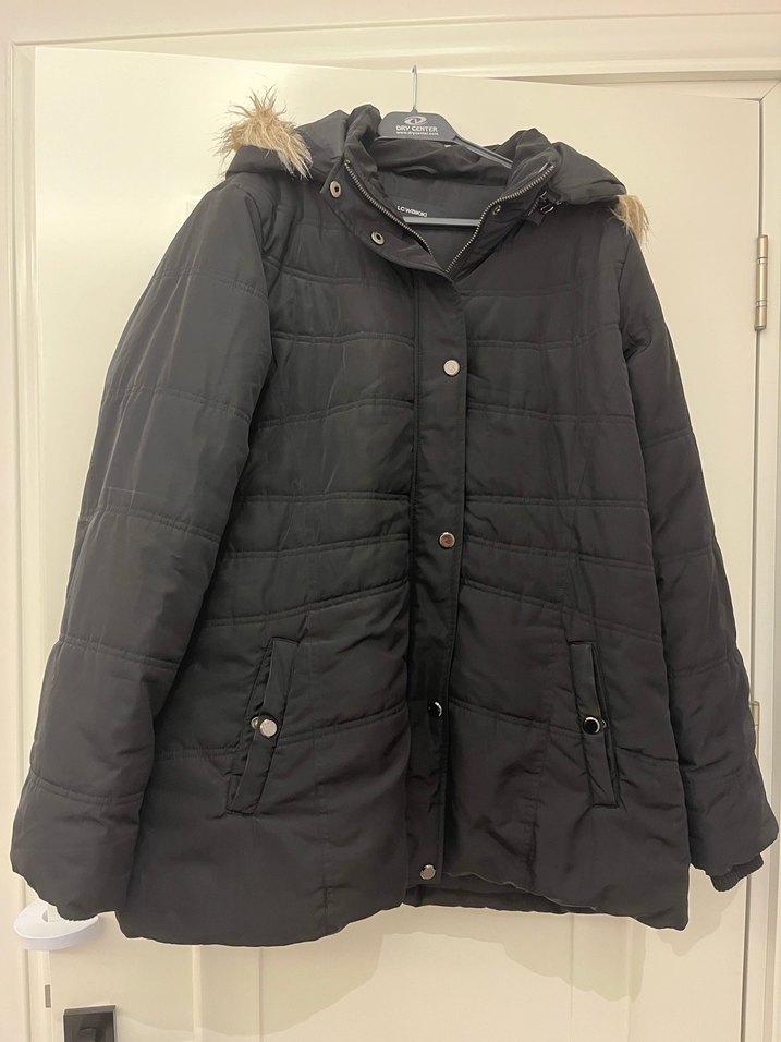 Sadece arkasında fotoğrafta görüldüğü gibi lekeler var. Siyah renkli kadın midi kaban, kapüşonunda kürk detayları ve keskin yakasıyla dikkat çeker. Uzun kollu ve vücuda oturan kesimiyle sıcak tutan yumuşak kumaştan üretilmiştir.