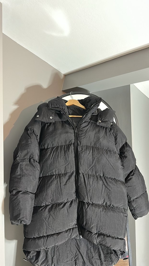 Siyah kadın midi uzunlukta kaban, yumuşak keten kumaştan üretilmiş ve kürk detaylara sahip. Strappy kollu, sade tasarımıyla dış mekan kullanımı için uygun.