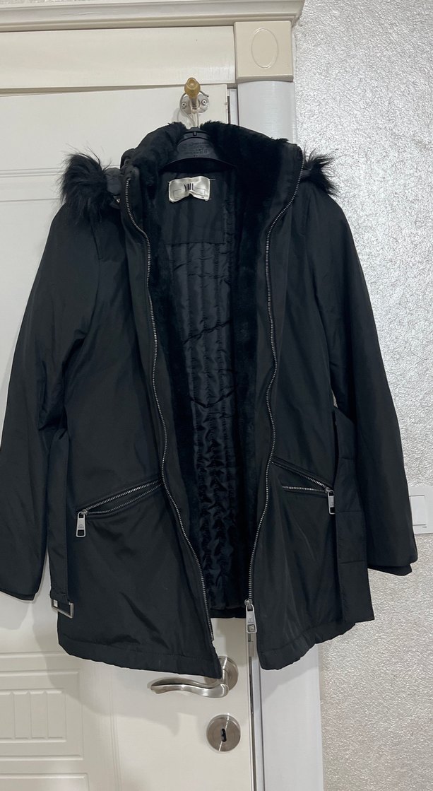 Siyah, vücuda oturan midi kaban, kürk detaylı ve kesik yakalıdır. Yumuşak kumaştan uzun kollu ve fermuarlı ceplidir, günlük rahat kullanım için uygundur.