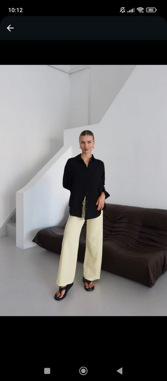 Siyah, hafif keten kumaştan kadın midi boy düz paça pantolon. Düzenli kesim ve desensiz minimalist tasarıma sahip, ofis için şık ve rahat bir model.