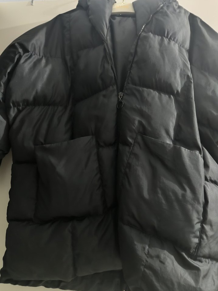 Siyah, fermuarlı ve kesimli midi uzunlukta kışlık mont. Yumuşak sentetik kumaştan, sokak stiline uygun rahat tasarım.