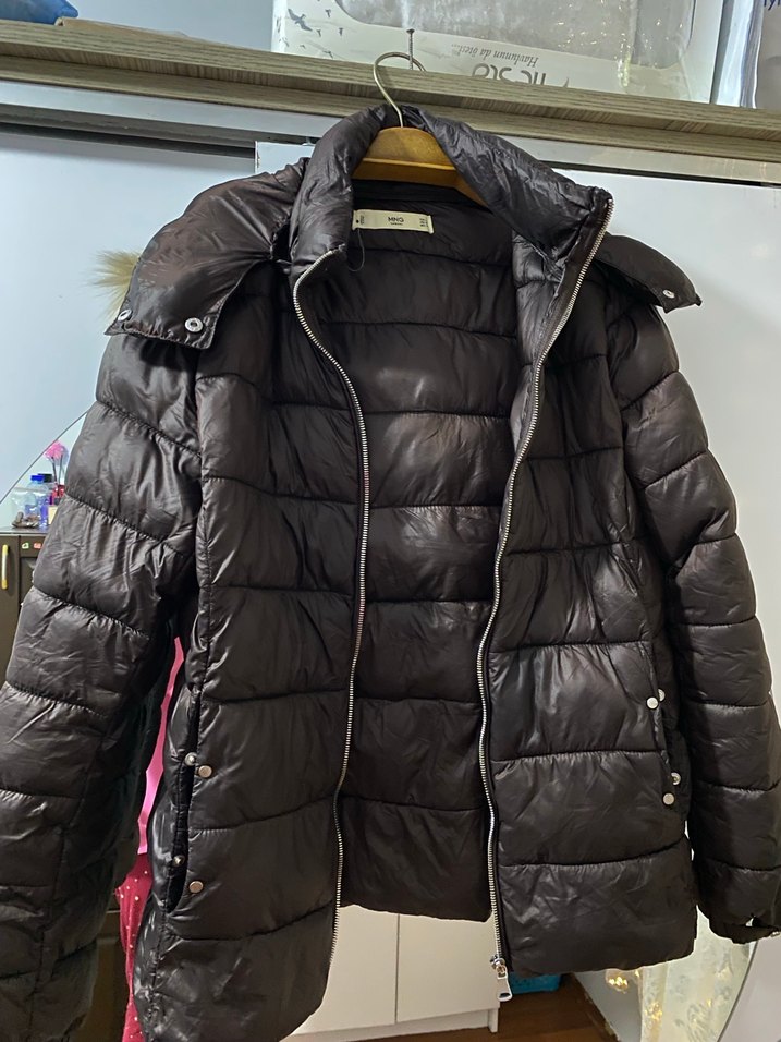 Fermuarlı, siyah, sentetik kumaştan yapılmış, midi uzunlukta, notched lapel yakalı, rahat kesimli kadın kışlık mont. M-L uyumlu