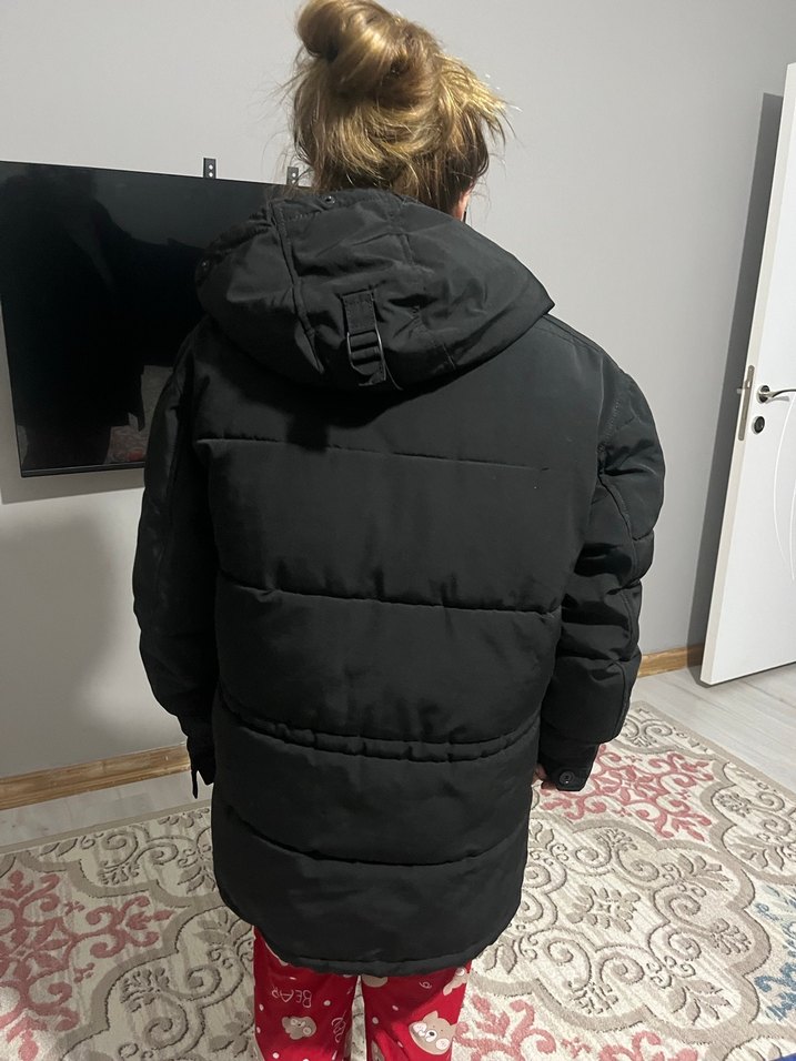 Siyah renkli, normal boyda, fitted kesim kadın kışlık mont. Yumuşak fleece kumaştan, uzun kollu ve yakasında kesik detay var. Tokalı detaylarla tarz katıyor. ❄️