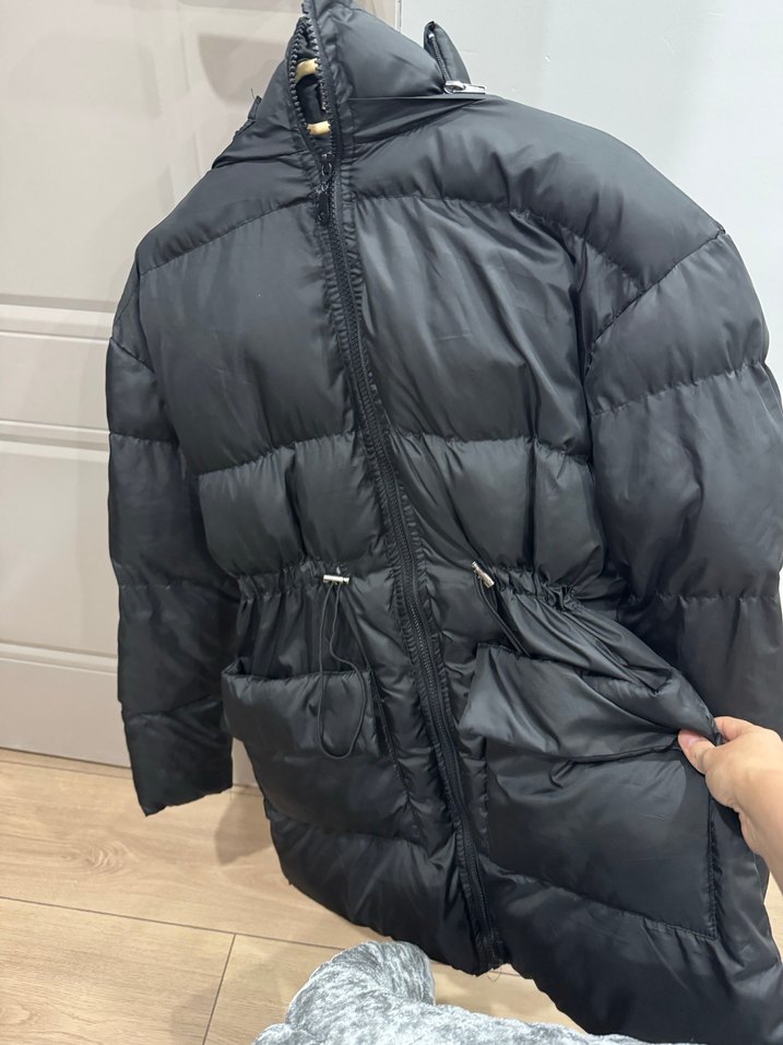 Siyah renkli, yüksek yakalı ve fermuarlı, sentetik kumaştan yapılmış, fit kesim midi kışlık mont. Sokak stiline uygun, günlük kullanıma ideal.