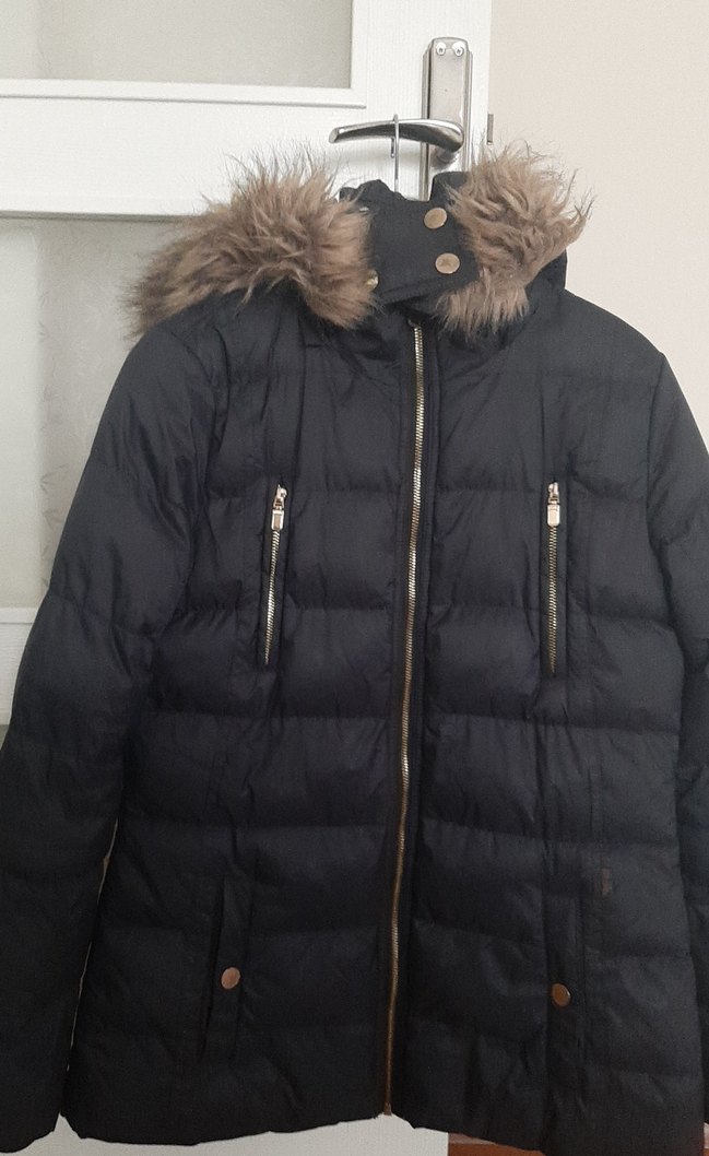 Fitted kesim siyah kadın kışlık mont, kürklü yakası ve askılı kollarıyla dikkat çeker. Normal midi boyda, sentetik kumaştan, günlük kullanıma uygundur.
