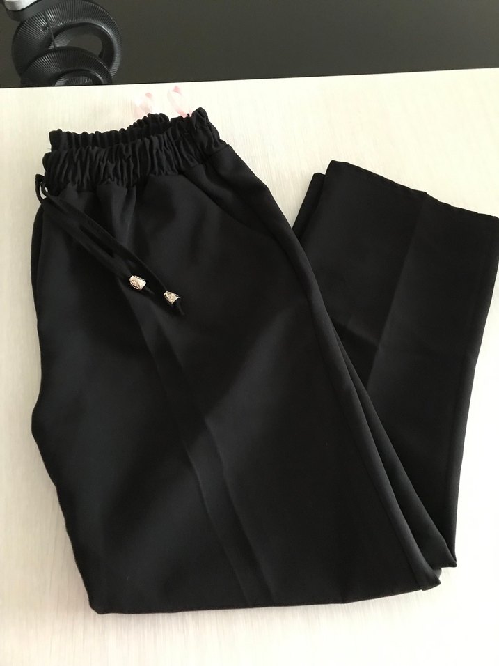 Siyah, midi boy, bol kesim kadın pantolon. İpek gibi kumaştan üretilmiş, kemer detaylı, günlük kullanım için uygun rahat bir tasarım. Etiketi yok ama hiç giyilmedi sıfır ürün.