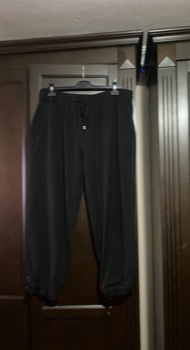 Satenimsi kumaştan, kemerli, bol kesim ve midi boy siyah kadın pantolon. Günlük kullanıma uygun, rahat ve şık sokak stili