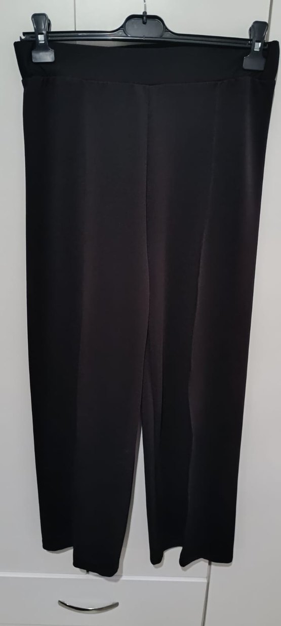 Siyah midi boy, regular kesim kadın kumaş pantolon. Yan yırtmaç detaylı, ofis kullanımı için uygun, düz ve desensiz tasarım.bedenler mevcuttur