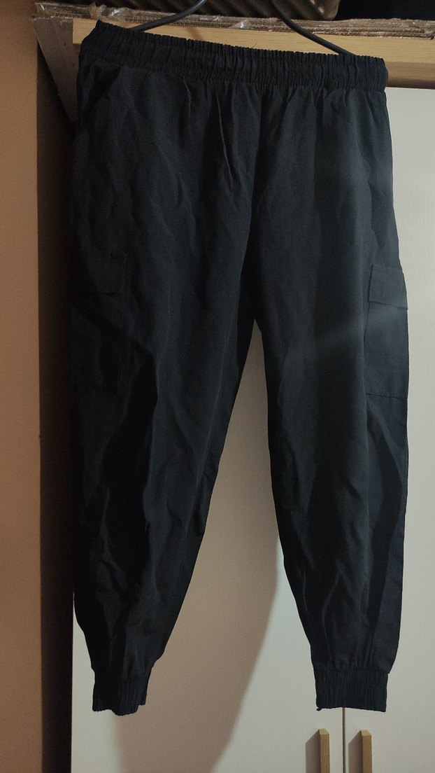 Siyah, bol kesim, midi boy kadın pantolon, ipeksi kumaştan, trend ve rahat bir görünüm sunar. Dış mekanlar için uygundur.
