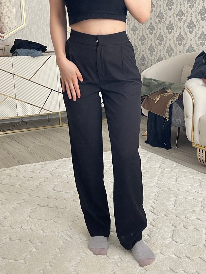 Düz siyah, midi boy, regular fit kadın kumaş pantolon. Ofis ve sokak modasına uyumlu, rahat ve şık bir tasarım.