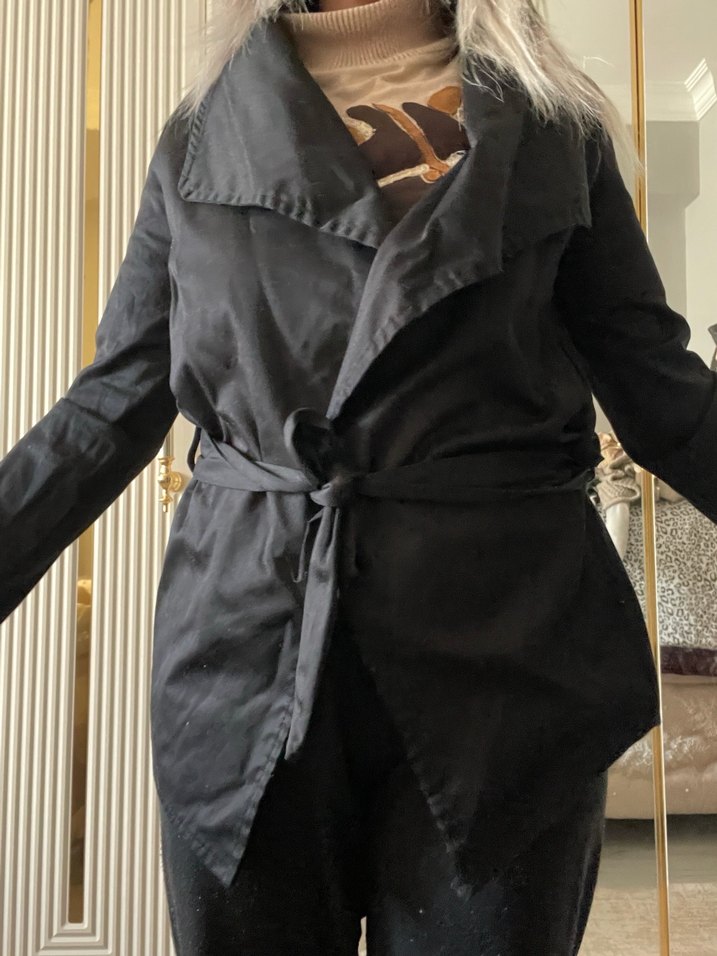 Siyah renkte, kuşaklı ve notched lapel yakalı midi uzunlukta kadın trençkot. Sentetik kumaştan, bol kesim ve askılı kollu, günlük kullanıma uygun.