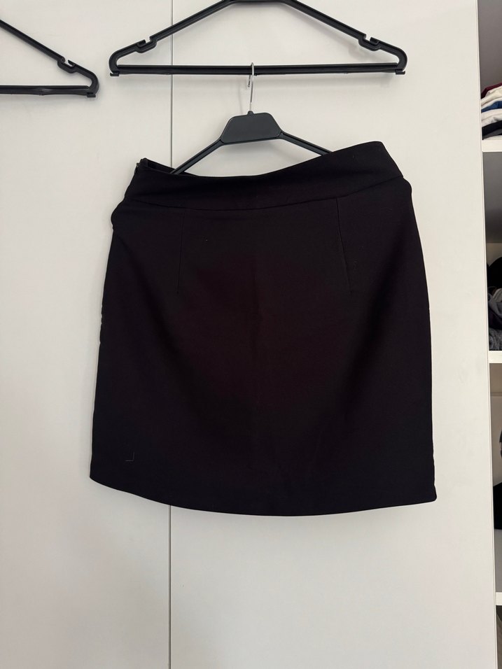Düz siyah, sentetik kumaştan yapılmış, ofis için uygun, minimal ve gotik tarzda, vücuda oturan midi mini etek. Rahat şıklık sunar.