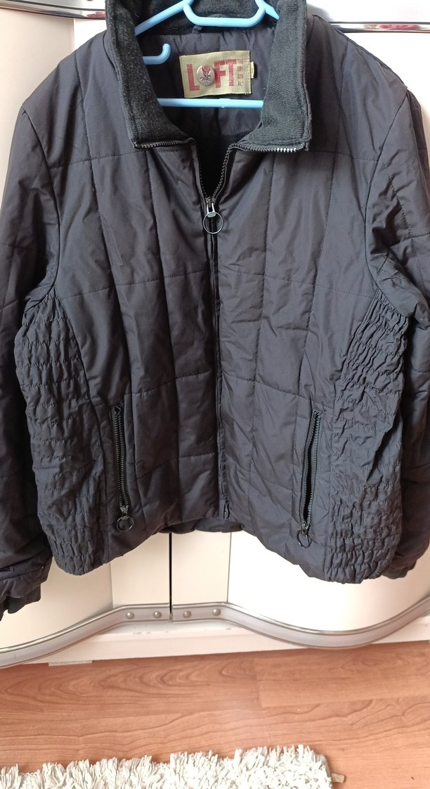 Siyah renkli, keten kumaştan yapılmış, fermuarlı ve cep detaylı, uzun kollu, normal boyda kadın mont Yan lastikerde biraz açılmaları var