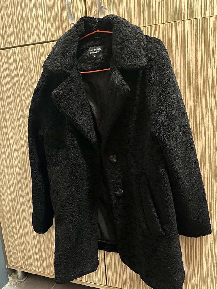 155/62 boy kilo ölçülerine tam oluyor. Siyah, diz boyunun biraz üstü uzunlukta, yumuşak peluş detaylı, geniş kesimli, notched yaka ve uzun kollu kadın kaban.