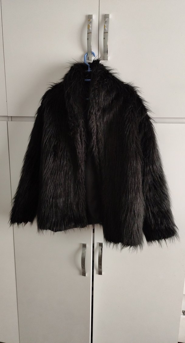 Siyah renkte, midi boyda, suni kürk detaylı, kesimli yakalı ve uzun kollu kadın ceketi. Yumuşak sentetik kumaştan, şık ve fit kesim.xl beden yeni