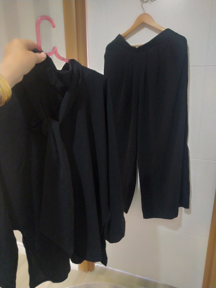 Siyah, uzun kollu, salaş kesim kadın takım. İpeksi dokusu ve yakalı kesimiyle ofis için uygun, drapeli ve desensiz tasarım.
