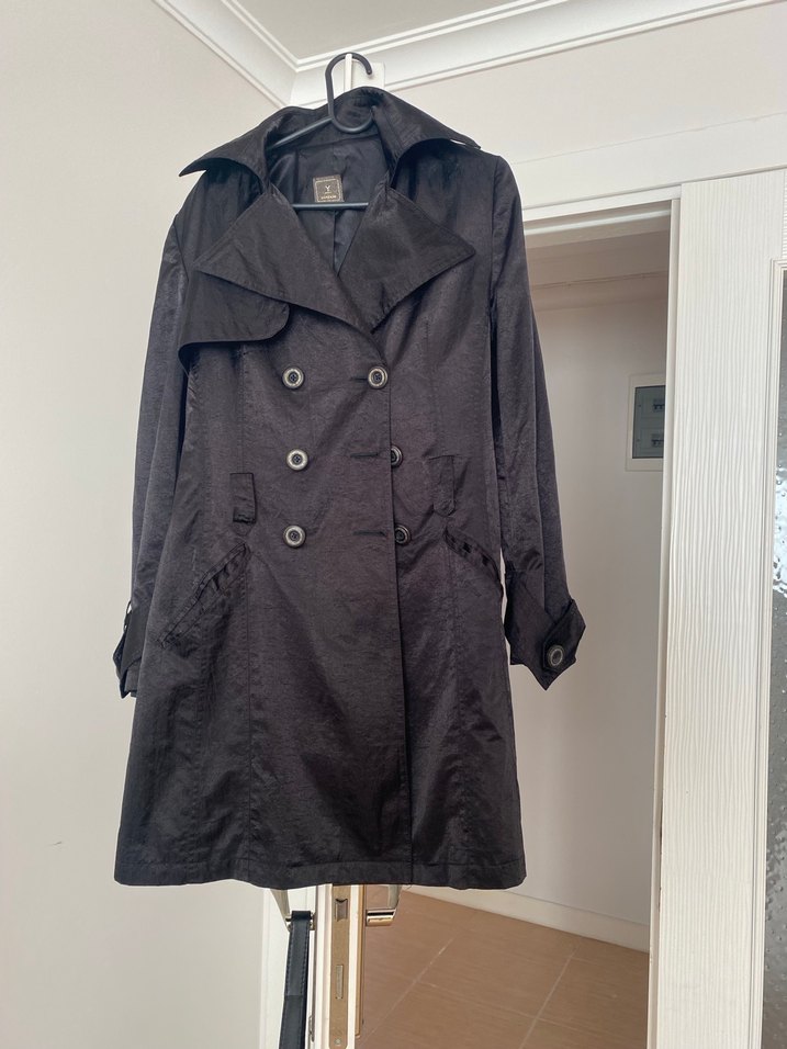 Siyah midi trençkot, yaka kısmı notched lapel ve düğmeli ön detaylara sahip. Keten kumaştan, bol kesim ve uzun kollu, günlük kullanıma uygun. En 42 uzunluk 90 cm