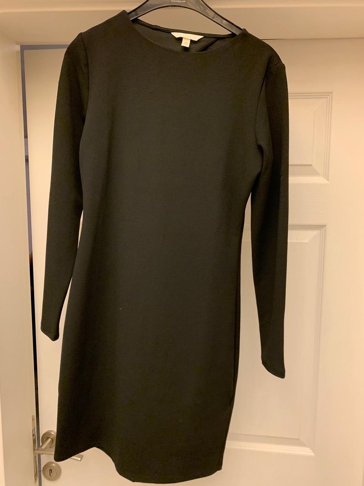 Siyah midi uzunlukta, uzun kollu ve yuvarlak yakalı kadın triko elbise. Sentetik kumaştan yapılmış, ofis için uygun, sade ve şık bir tasarıma sahip.